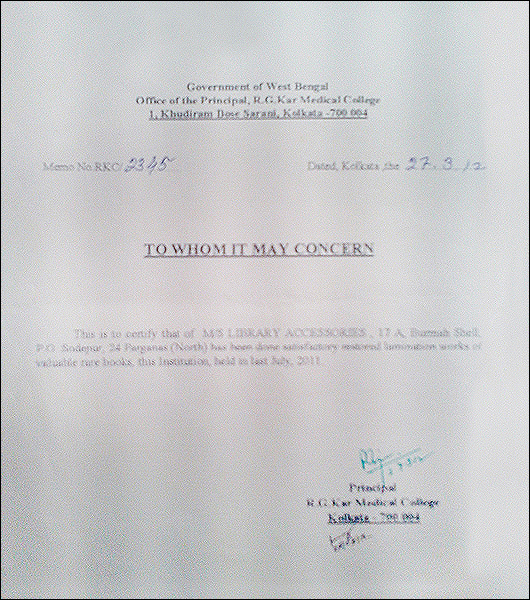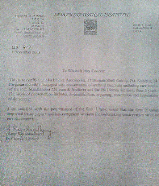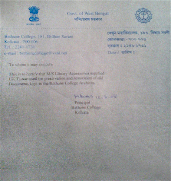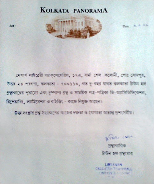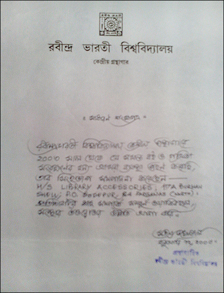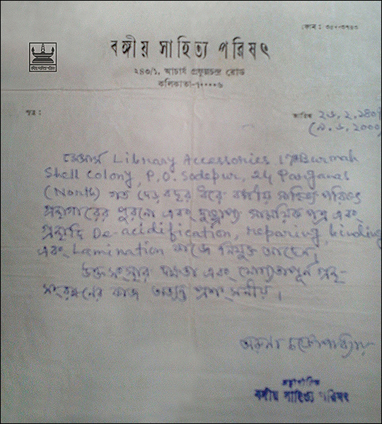 >> Acknowledgement letter from Bangiya Sahitya Parishat Library |